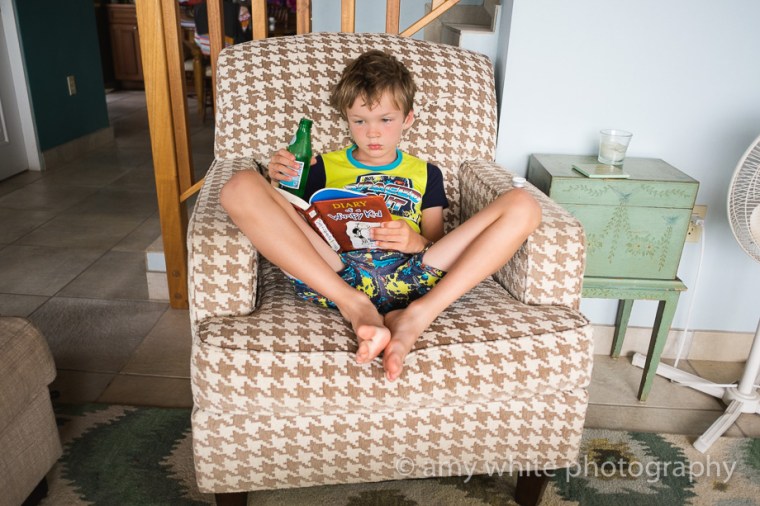 Starting his morning with some San Pellegrino and Diary of a Wimpy Kid.