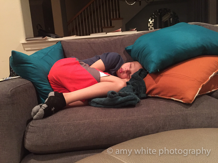 And he\’s sick again with the same fever and congestion. Passed out on the couch.