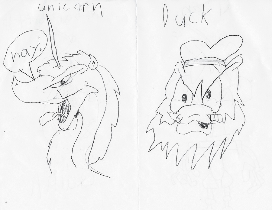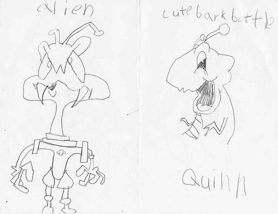 Quinn was in a huge cartooning phase and I found a free class at one of our local libraries. A cartoonist walks the kids through drawing characters one step at a time. Here are Quinn\’s results.