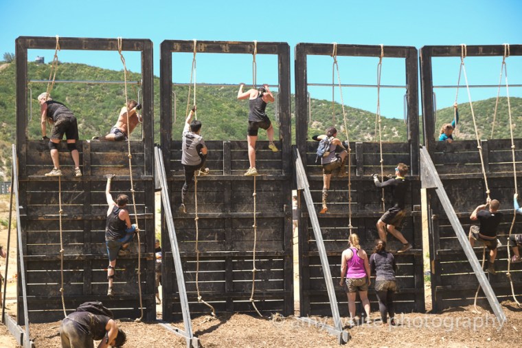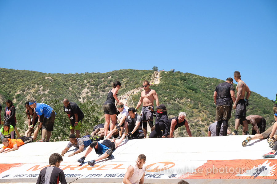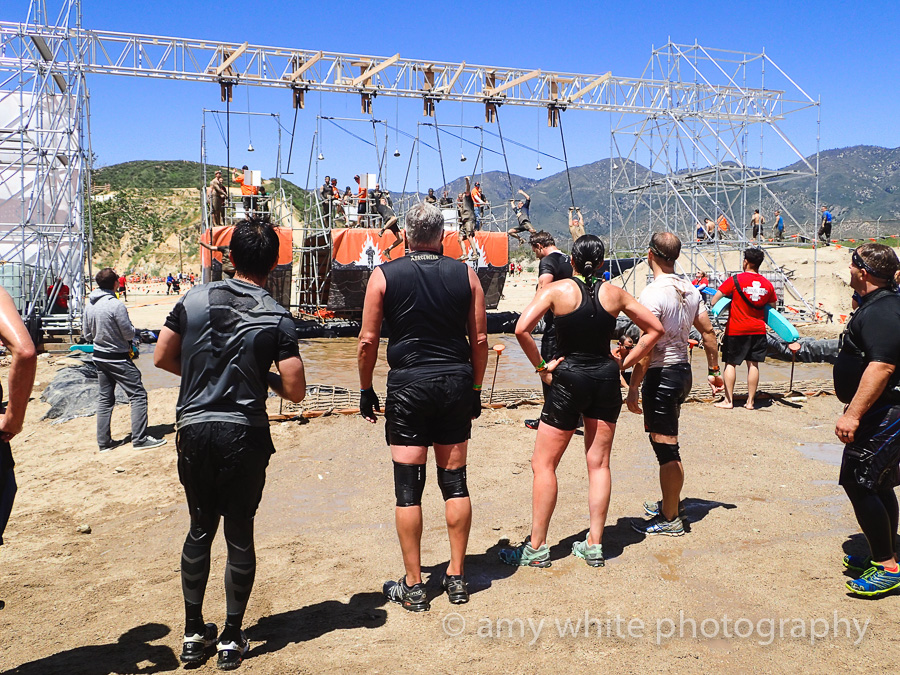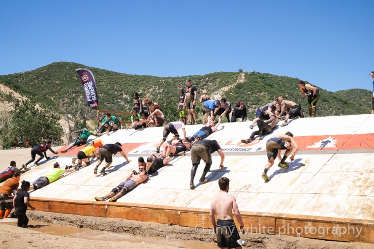 Then it was back to Don\’s race! We caught up with them at the Pyramid Scheme. This obstacle doesn\’t look so bad but was tricky because it was slippery and wet. Teams were having alot of trouble getting up. But Don\’s team formed a chain and they were up and over this obstacle in about 2 minutes! You can see their human chain right in the middle.
