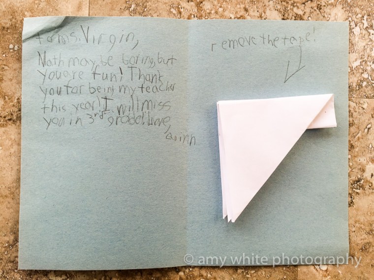 The night before the last day he was feeling very sad about missing his 2nd grade teacher, Ms. Virgen. He wrote her this very sweet note and attached a prize jet wing origami.