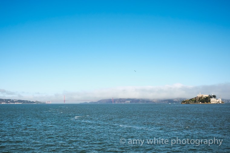 A view towards Alcatraz on the right and the Golden Gate Bridge to the left.