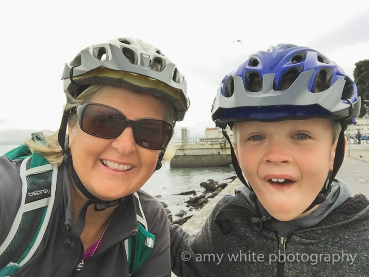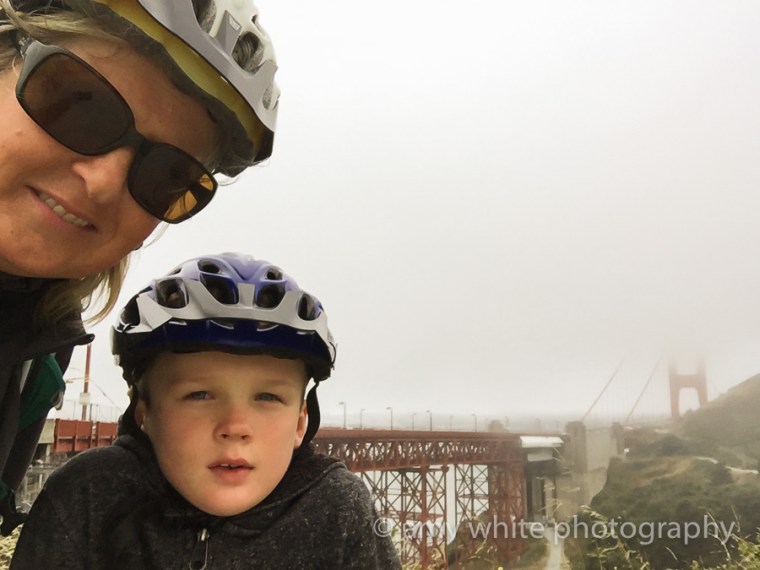 Then it was time to get on the 1:10 pm ferry back to SF. Although the trip was alot of fun, it was more harrowing than I expected. The big hills in the beginning, the winds on the bridge were really strong, there were lots of serious bikers that were going really fast over the bridge, slippery conditions, and then finally the riding into Sausalito was on the road with all the traffic. It made this mama very nervous. But we did it!