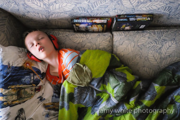 Our Funny Boy Published on October 5, 2016 by amyewhitelivecom Sleeping on the love seat, in a sleeping bag, wearing headphones, and with his Stephen Hawking reading material nearby. Yep, that\’s our kid. Share this: Click to share on X (Opens in new window) X Click to share on Facebook (Opens in new window) Facebook Like Loading... Related