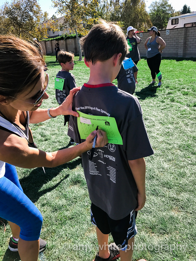 Quinn getting his laps marked. In previous years the kids had to run a certain number of laps to get a free Baskin Robins card but this year they just had to collect a donation. Ha! So I encouraged Quinn to fully participate but not worry about the number of laps he ran.