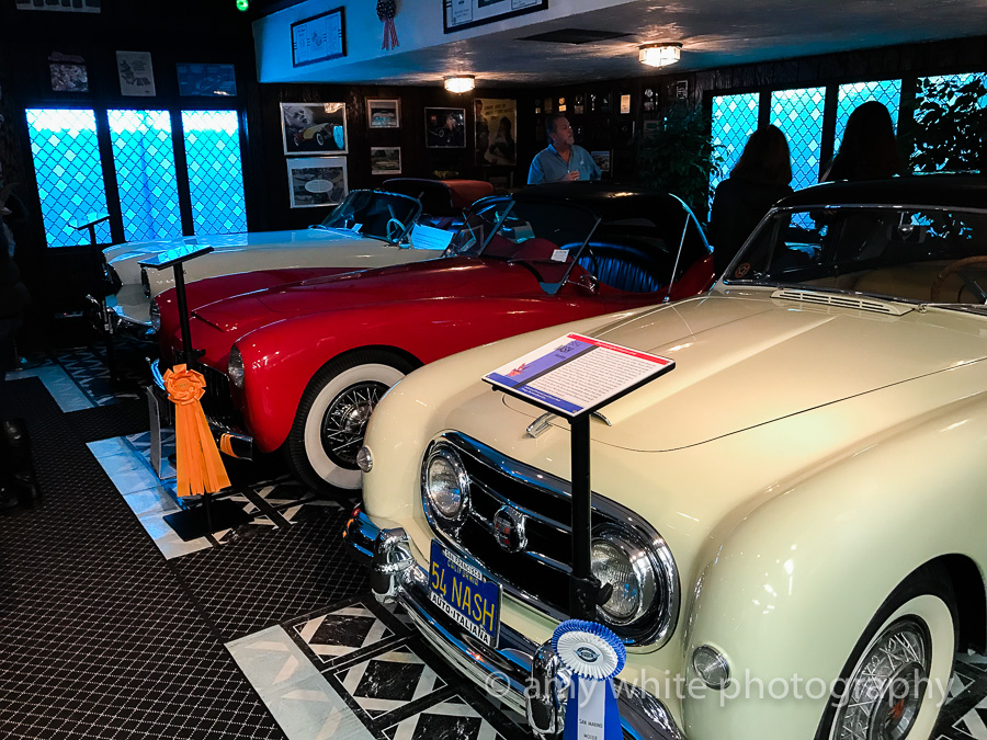 The father has passed away but our friend still takes these cars to car shows. There are 3 or 4 not pictured. The cars are in amazing condition and quite unique. Yes, this is in their house!