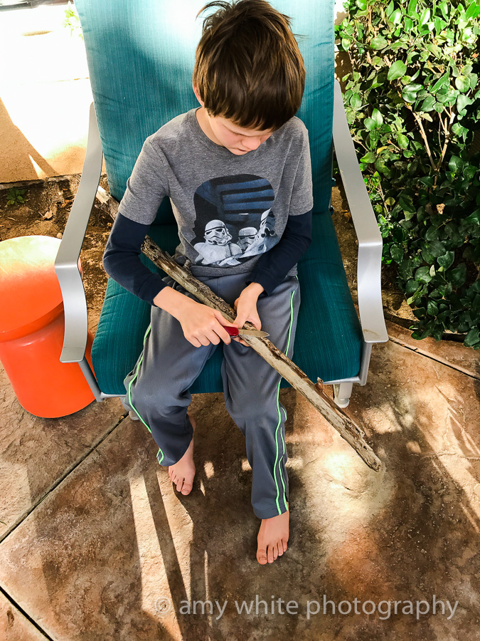 Quinn has been working on his walking still to make it a little bit smoother. A little whittling, a little sanding, etc.