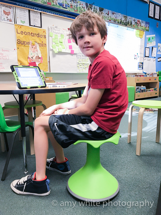 His 3rd grade teacher generally uses the green IKEA stools in her classroom but brought in a regular chair for Quinn. But he was still tipping his chair so much that she got him this wobbly stool. He can tip all he wants but it won\’t tip over. Quinn loves it!