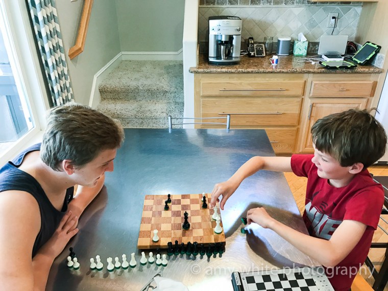 Ty and Quinn playing a round of chess that ended in a draw.