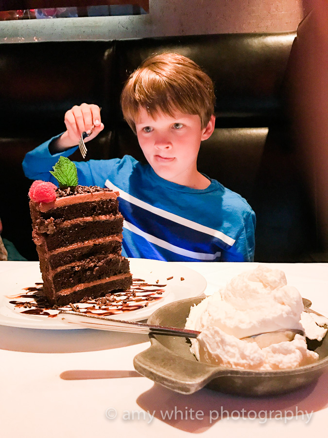 We went to a fancy steak house for dinner where Quinn had to be on his best gentleman-y behavior. He was pleased to see a couple of other kids in the restaurant so he wouldn\’t be so \”embarrassed\” to be the only kid there. And he thought dinner was pretty great, especially the dessert. We all put in a good effort but weren\’t able to finish this giant piece of cake.