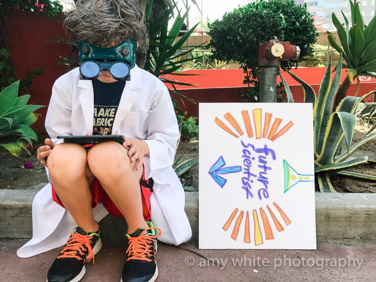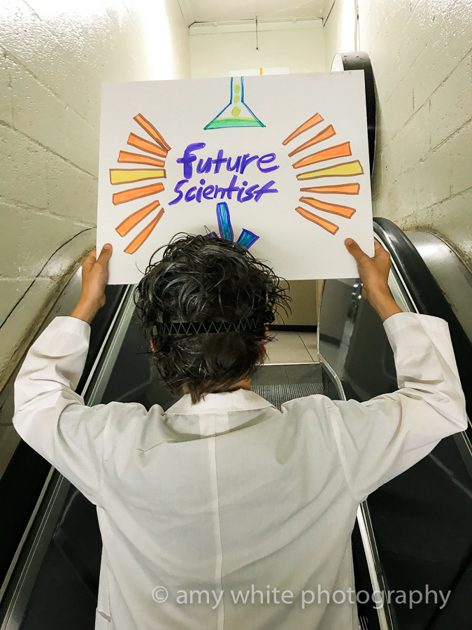 This kid was pretty excited to participate and wanted to wear a \”mad scientist\” outfit. He also insisted on making his own sign. The other side said Science not Silence.