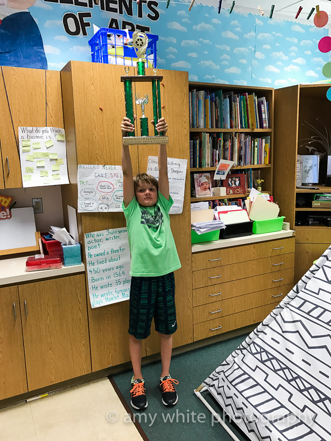 His class earned the recycling trophy. I\’m not sure exactly what they did to earn it but they were pretty happy!