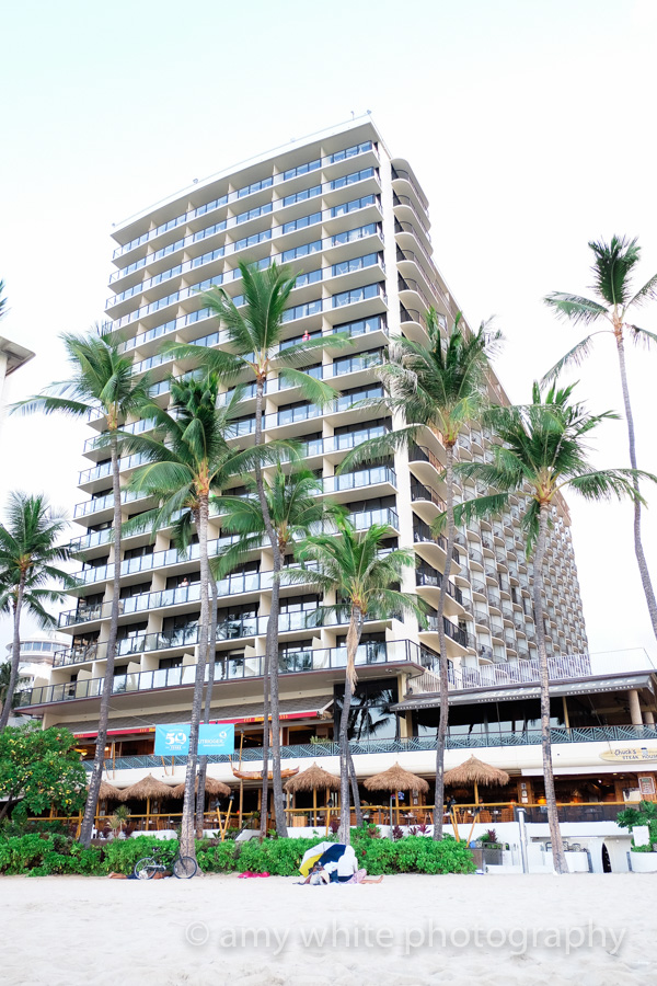 Our hotel. We had a room on the right hand side. Dukes is on the lower level with the straw umbrellas and the Hula Grill is on the 2nd level with the red awning.