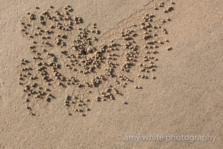 There are these little crabs on the beach that get to work first thing in the morning digging their holes as the tide goes out. They put the sand in their mouths and create these little sand balls.