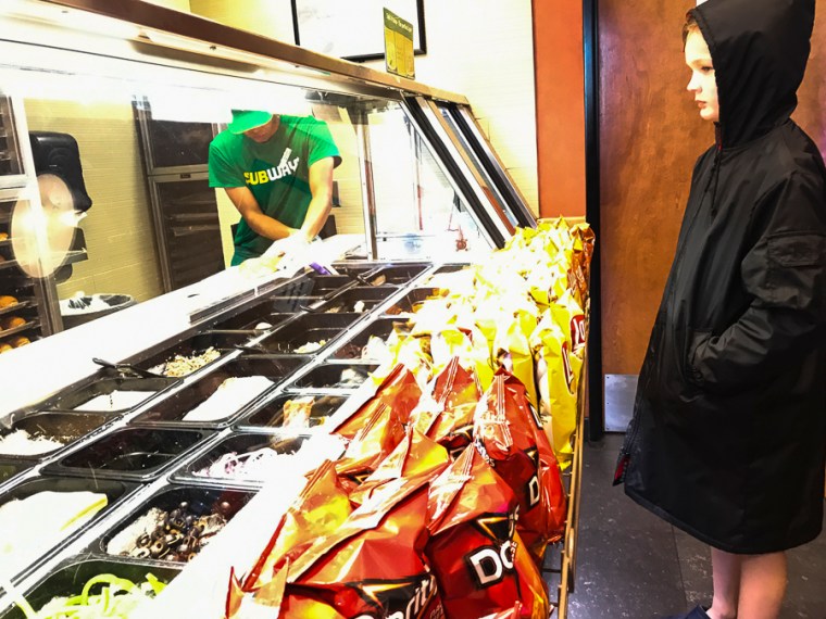 Of course he is starving after swimming so he wanted a Subway. And he was insistent on learning how to order his own sandwich. So here is our kid taking charge and ordering his own foot long roast beef on 9-grain wheat with lettuce, tomatoes, pickles, lots of olive, mayo and s & p. Love this kid!