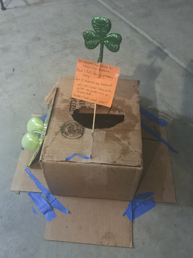 The final product. Unfortunately the leprechaun chewed his way out of the trap.