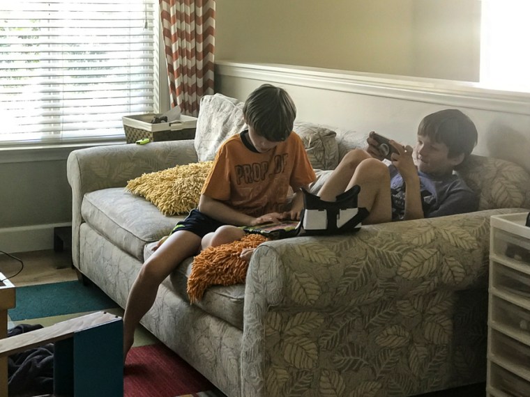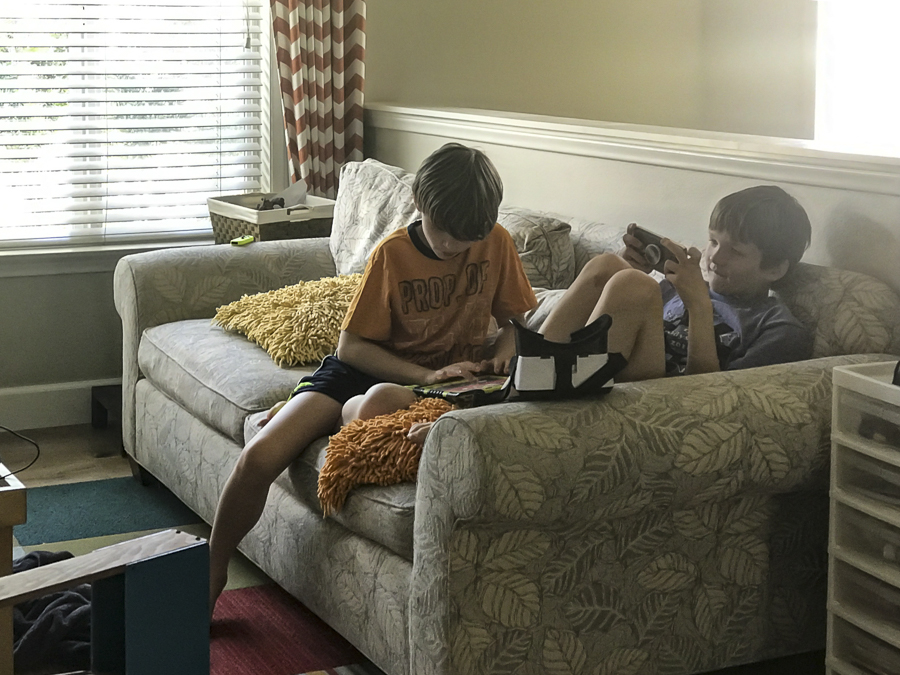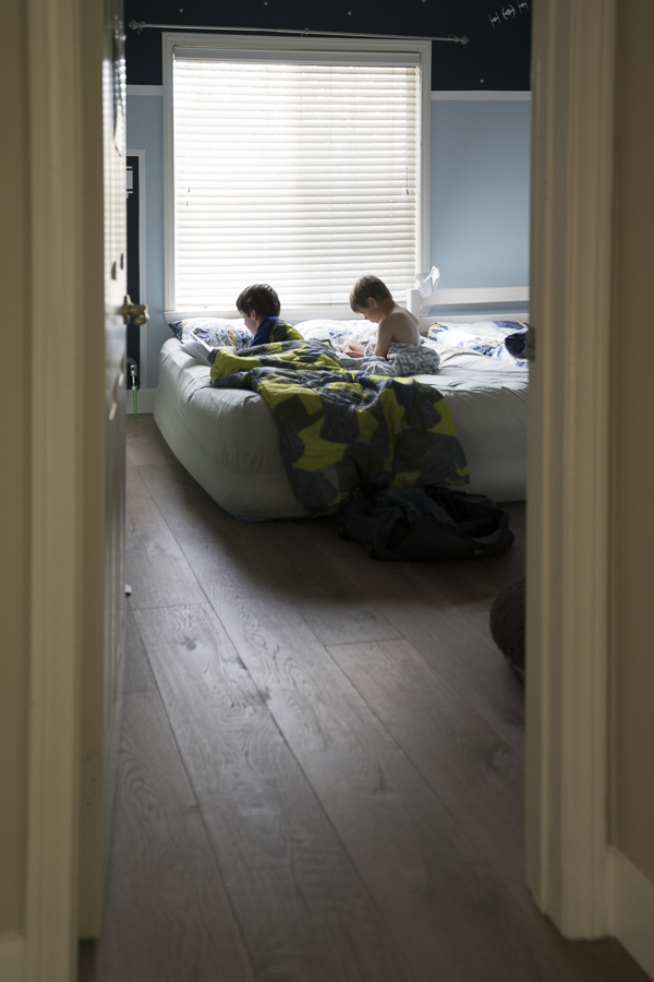 The next morning reading and playing games in bed. It was a pretty great weekend for our guy! And both overnight guests were lots of fun to have around.