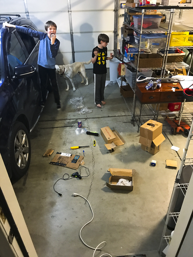 And then out to the garage to work on the leprechaun trap. They have had alot of practice in Odyssey using saws, box cutters, and hot glue guns that they were able to work very independently.