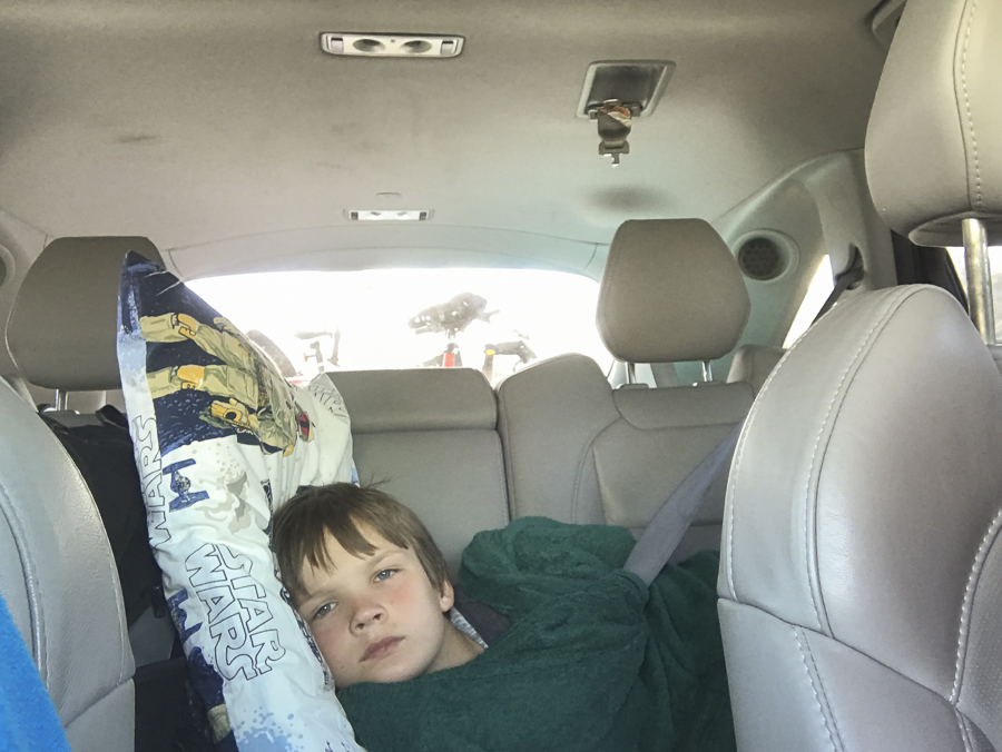 We got up at 6 am in Riverside to drive home. We were home about an hour to shuffle our luggage and load the bikes. Then off to Monterey to meet the Conrath\’s. Needless to say the kid was tired so we made sure he had some comforts.