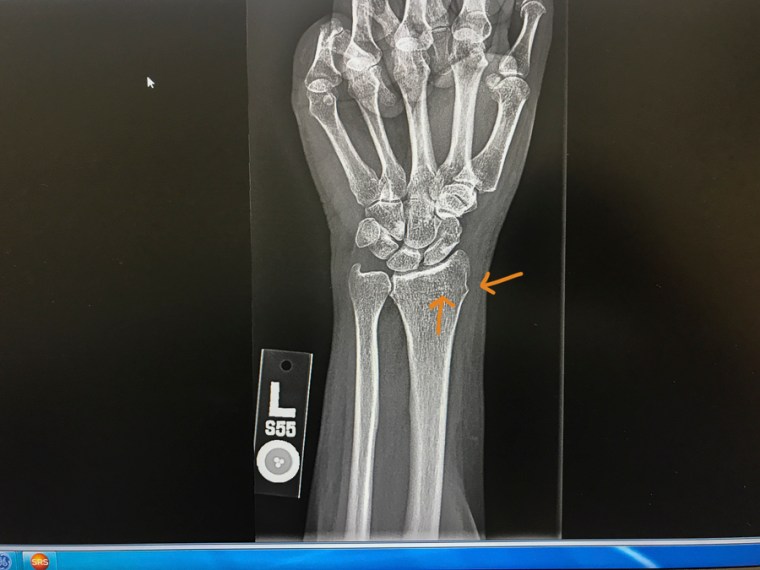 My xray. The fracture is the horizontal white line right above the arrow on the bone. You can also see that the bone buckled a little bit on the side with the piece pointing out.