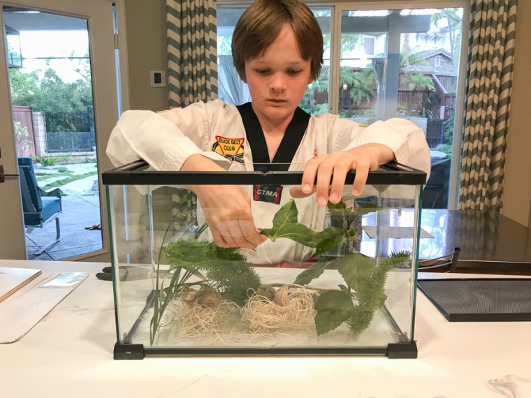 So we went out and got a terrarium that Quinn made into a home. He really wants to keep 2 of them as pets but they need to be fed live bugs. We\’ve agreed that he will let them all go and if one returns as an adult and he can capture it then he can keep it. Let\’s just hope he forgets that part.