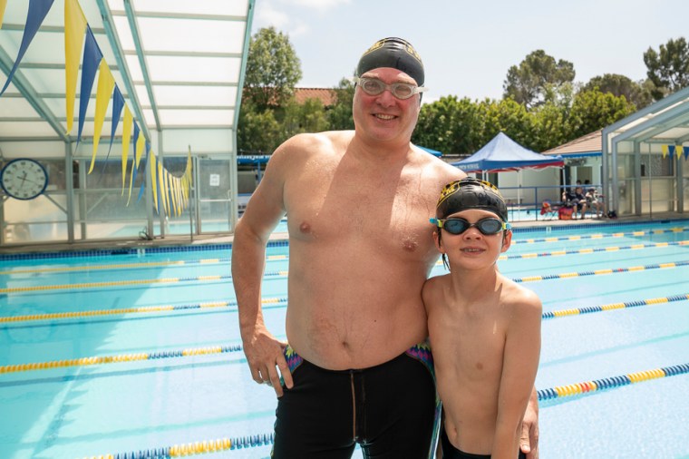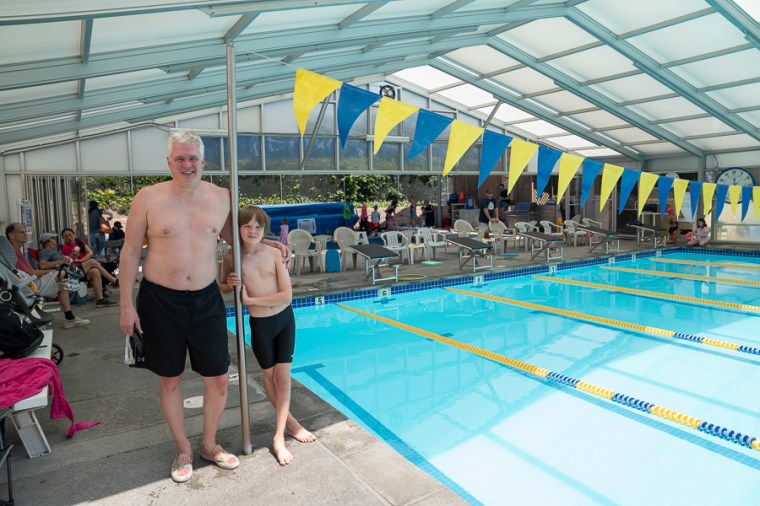 Don and Quinn swam in their first swim meet together. It was a fun event with the Daland Swim Team being split into two groups: Pink Team and Black Team. Don and Quinn were drafted for the black team.