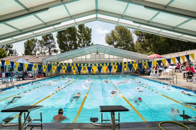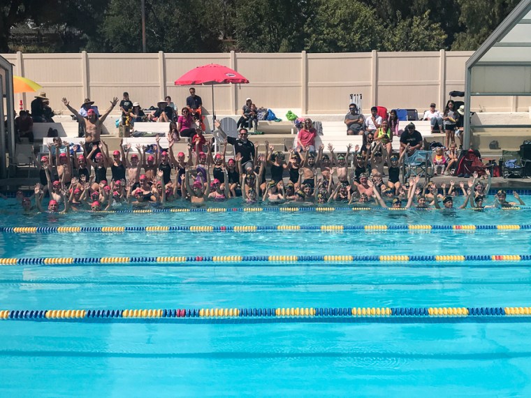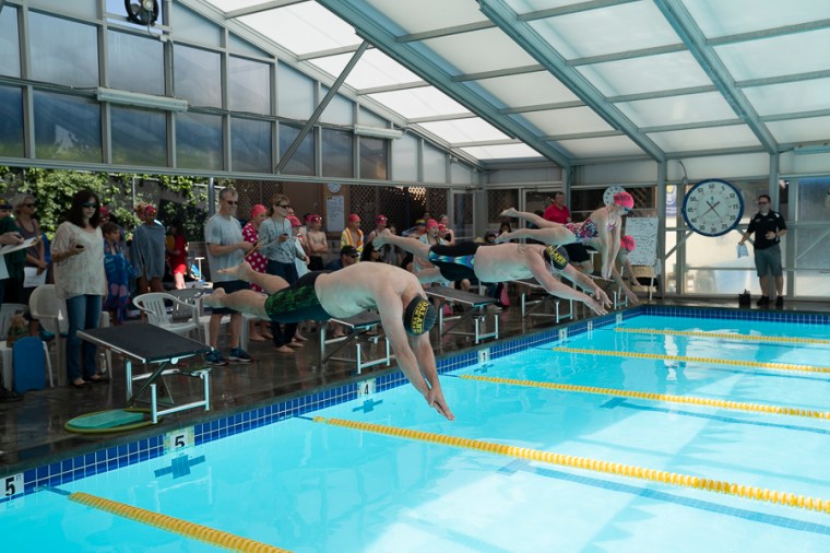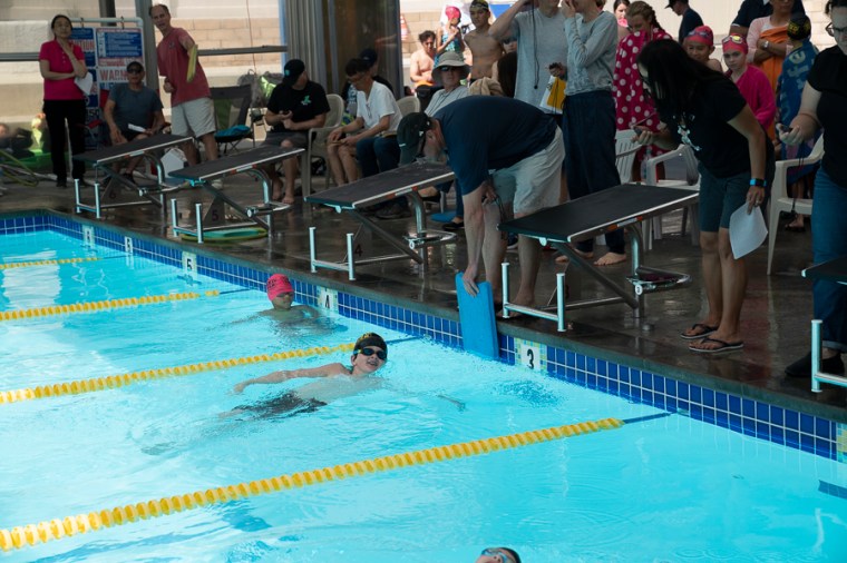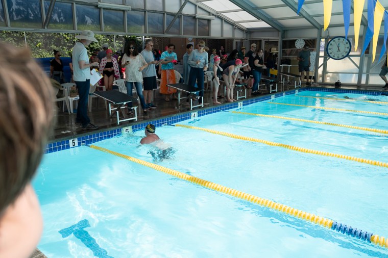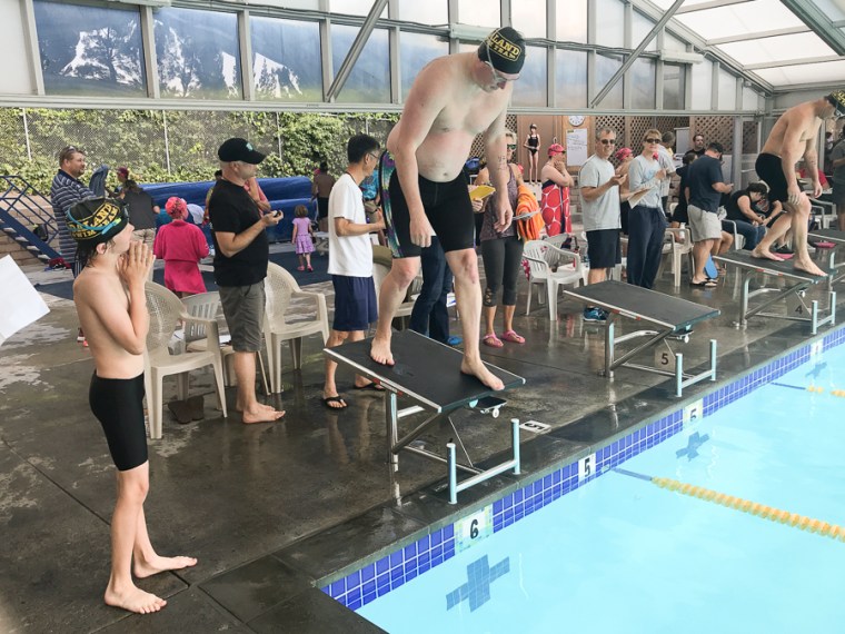 And they\’re off! Don is in lane 4. The high flying woman in the pink cap next to Don is Coach Adrienne who usually coaches Quinn\’s team. There were a handful of adult swimmers and most of them swam in college and were pretty good.