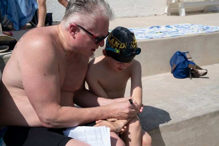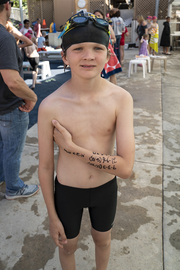 Don swam in 5 events and Quinn in 4. The trick is to write your event number, heat, and lane on your arm.