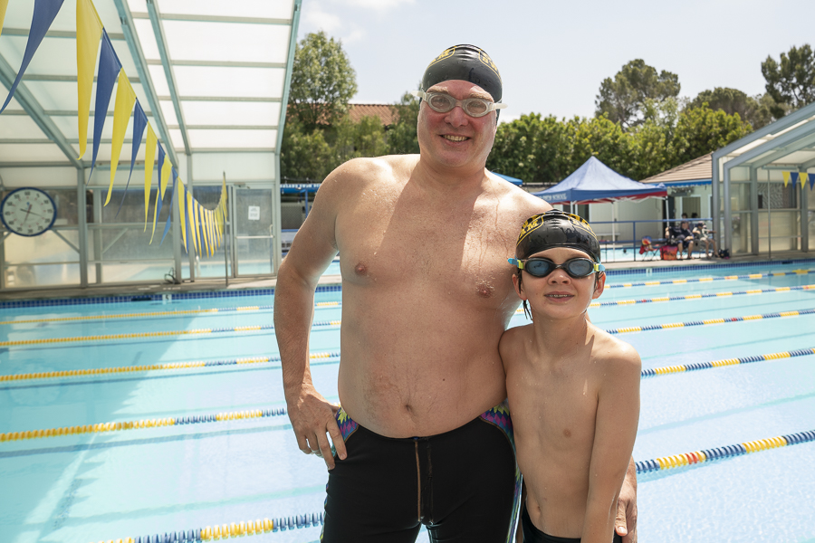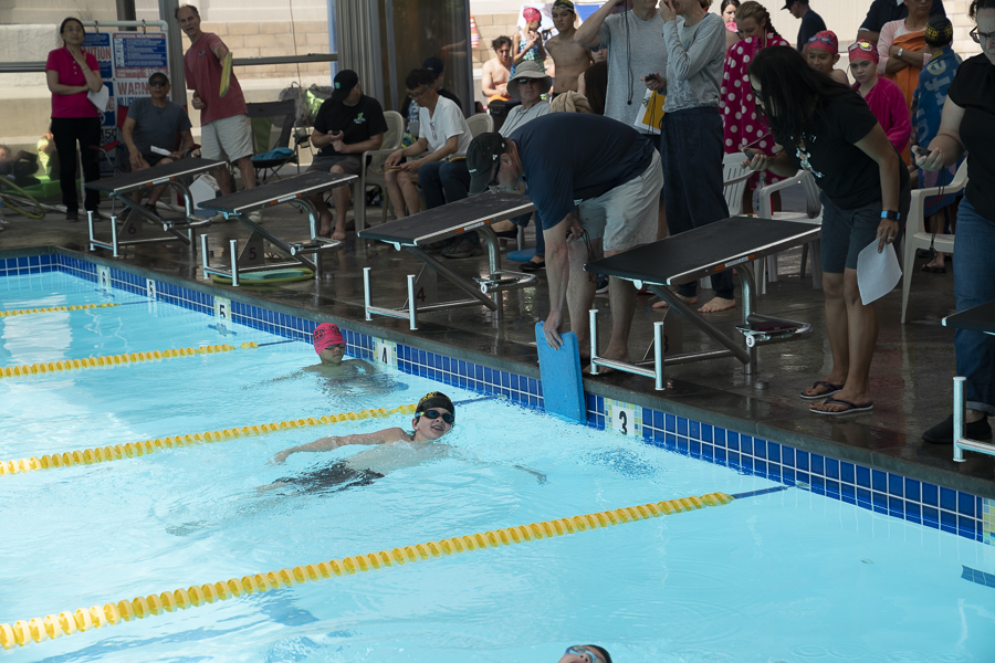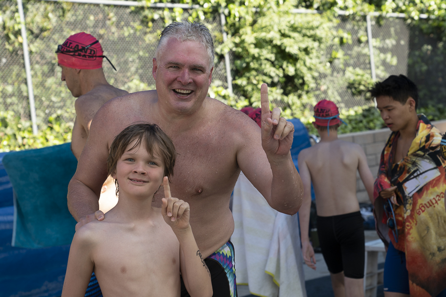 Don and Quinn swam in their first swim meet together. It was a fun event with the Daland Swim Team being split into two groups: Pink Team and Black Team. Don and Quinn were drafted for the black team.