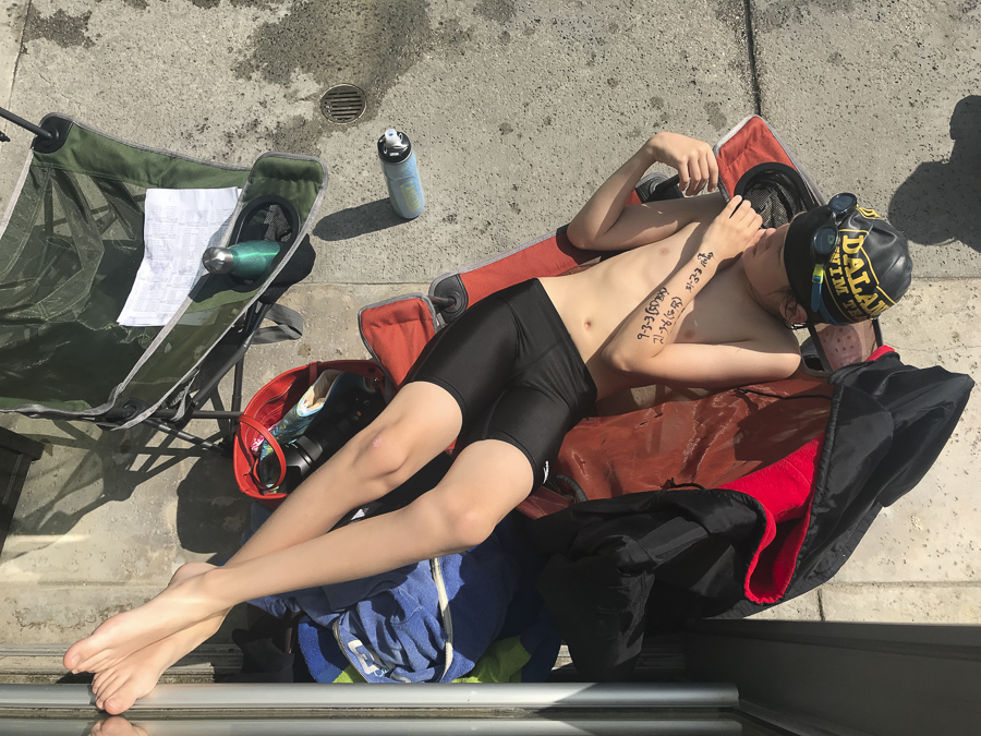 Don swam in 5 events and Quinn in 4. The trick is to write your event number, heat, and lane on your arm.