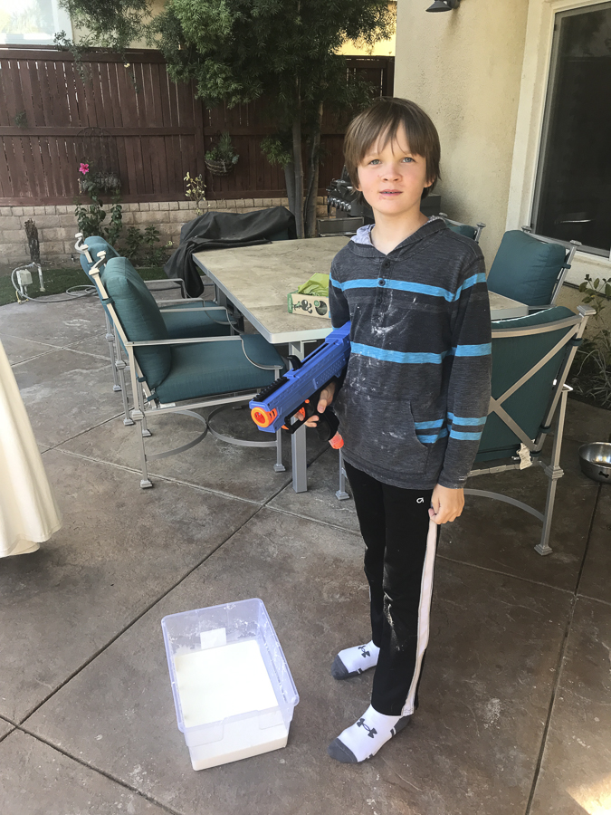 Getting outside to make some oobleck. When I was a kid it was called cornstarch and water. This is a bucket full of 5# of cornstarch and water. Begin the experiments — nerf darts, soccer ball, hammer, etc.