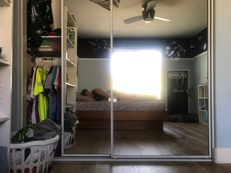 Just a mom chilling out in her sons room after he gets out of bed as the breeze flows through the house.
