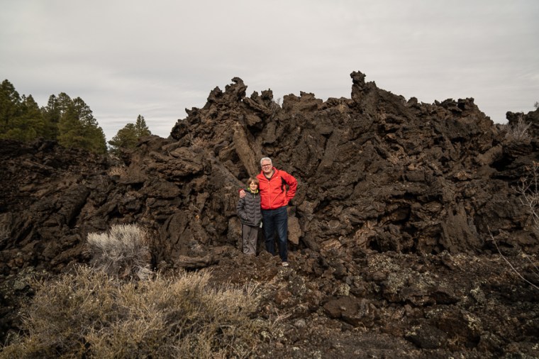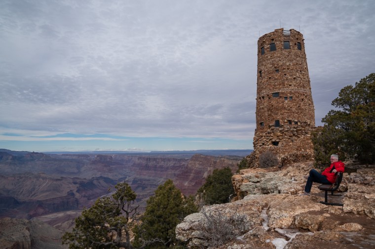 The Desert View Watchtower. We climbed to the top. I thanked Don for wearing that red pop-of-color coat!