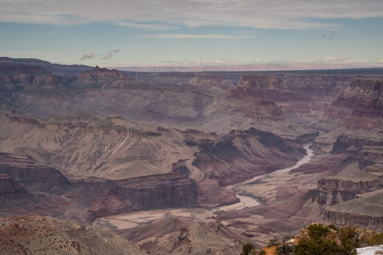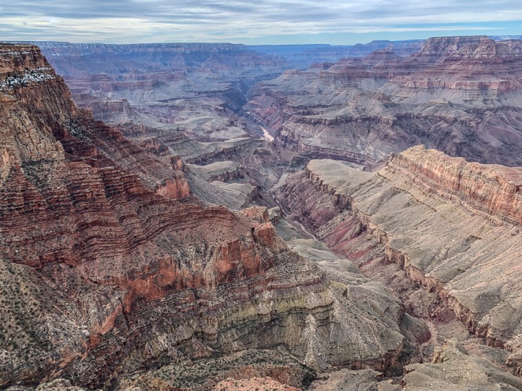 You can see the Bright Angel Hiking Trail that leads to the end of the plateau. Easier to get down than up. There is a camp group in the group of trees in the middle of the trail.