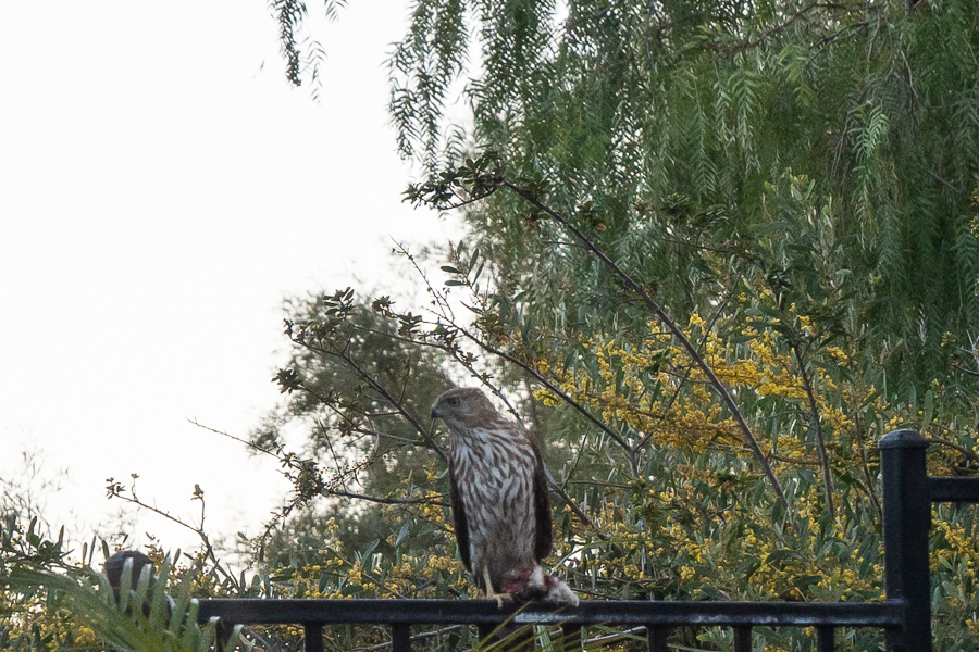 We are occasionally visited by hawks in the back yard. I think they hunt in the open space behind our house so they like to sit on the fence.