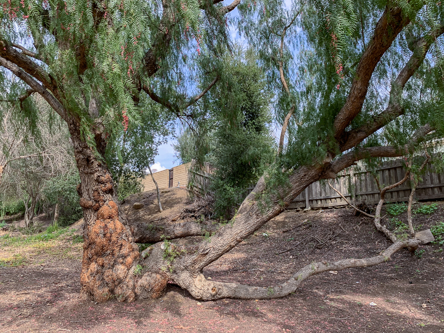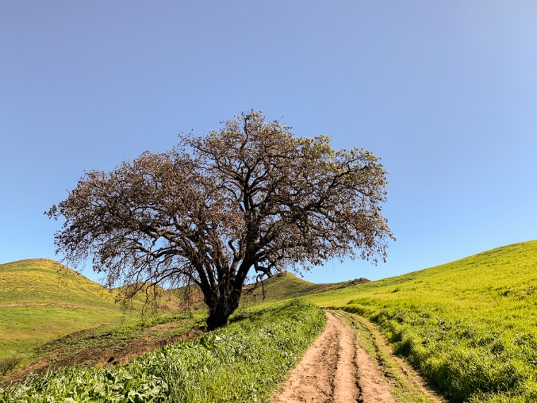 Morning hike with Sonic. This tree was charred by the fires but is now covered with new green growth!