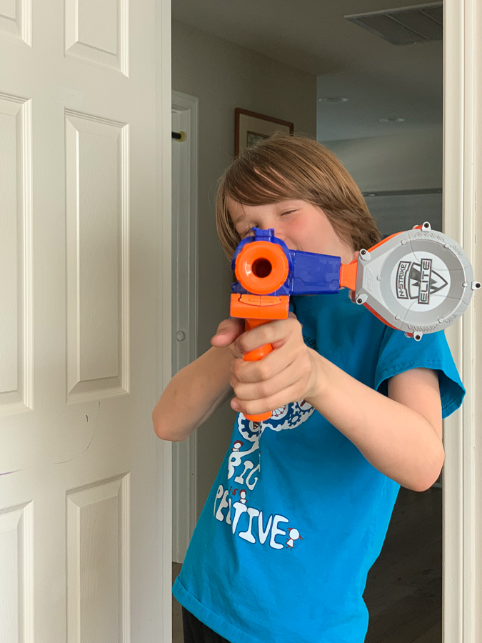 This boy is back into his Nerf guns and he checks the front door on an hourly basis when he has a new one coming his way. Look at that glorious hair!