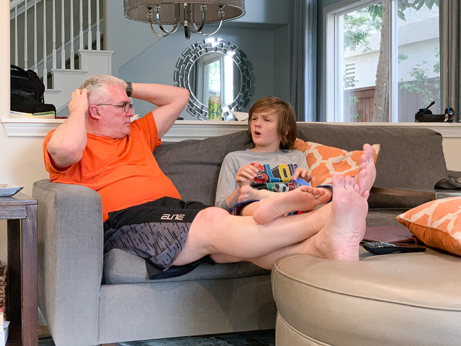 Serious father/son discussions. Look at those feet!
