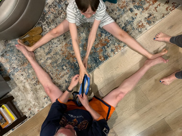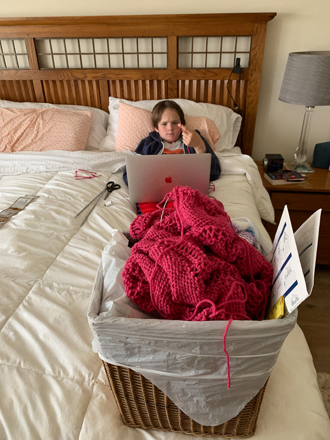 I brought home mom\’s knitting basket and Quinn thought he might teach himself how to knit using You Tube.