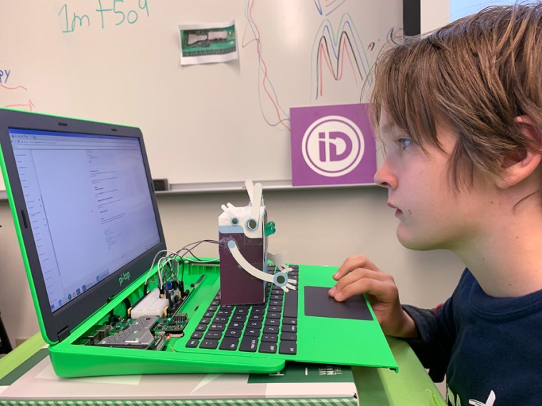 His laptop connected to a robot. The goal was to make the eyes light up.