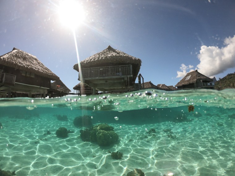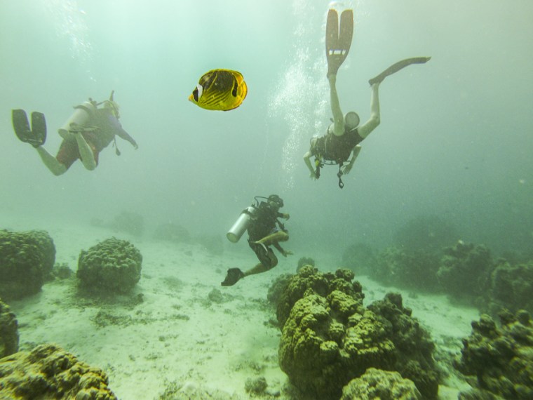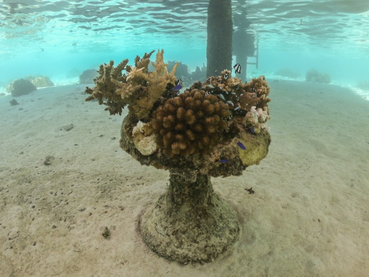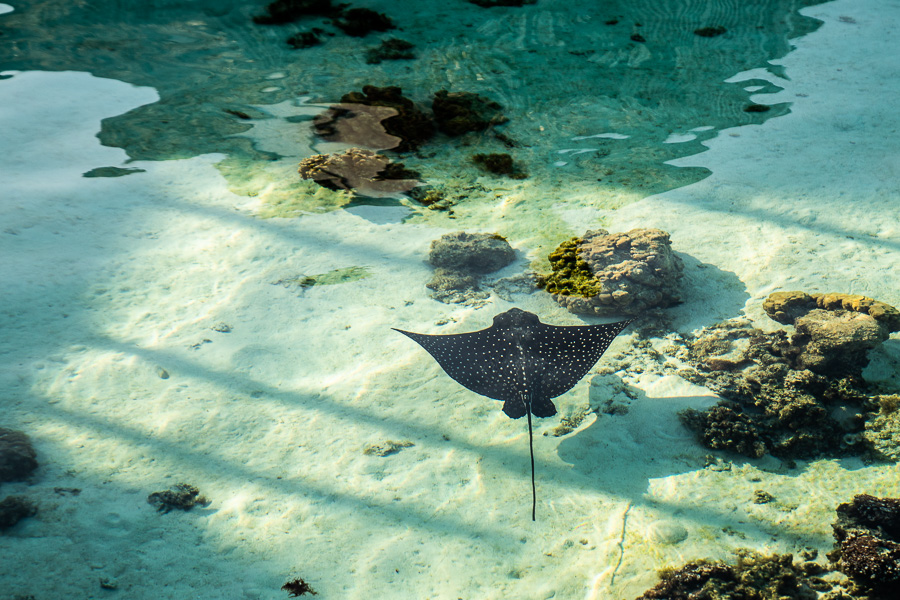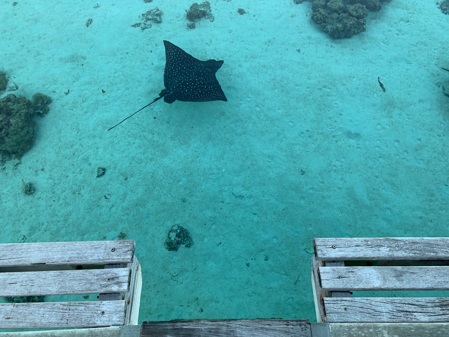 There is a planted Coral Garden under the bungalow under the glass window in the floor. It looks like there are many generations of fish on this coral head.