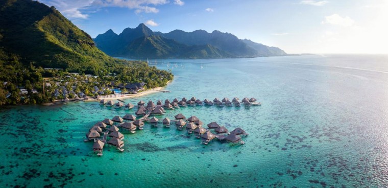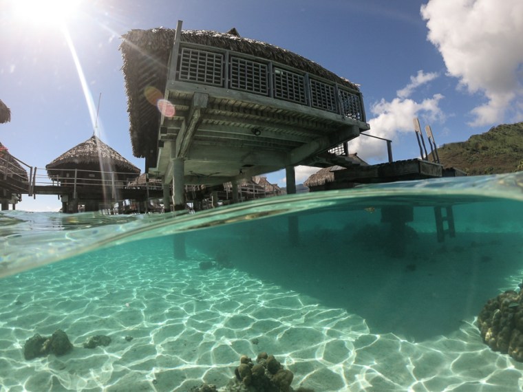Here are a couple of pictures I pulled off the internet that show the resort from above so you can get a better feel for the layout. There was a long wooden walkway from the beach out to the OWB\’s. Our OWB was the 6th from the very top right end. You can kind of make out a larger circular hut in the middle about 6 huts from the beach. That was the Crepe Restaurant — it was only open for dinner.