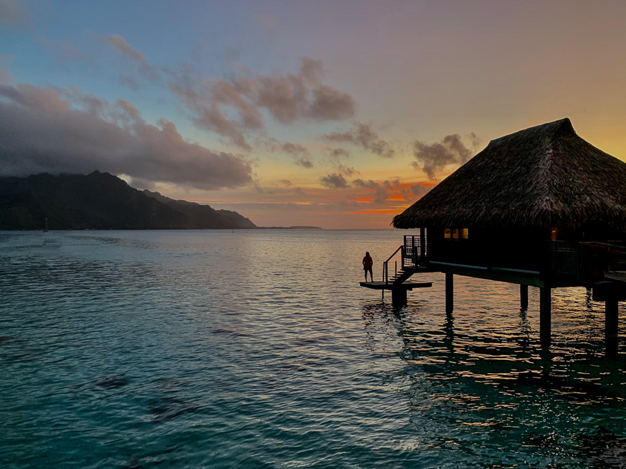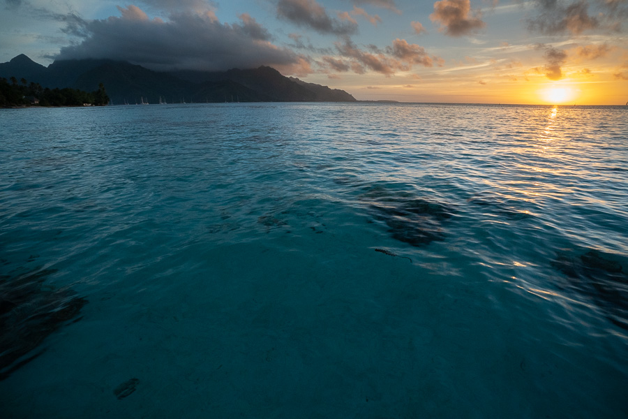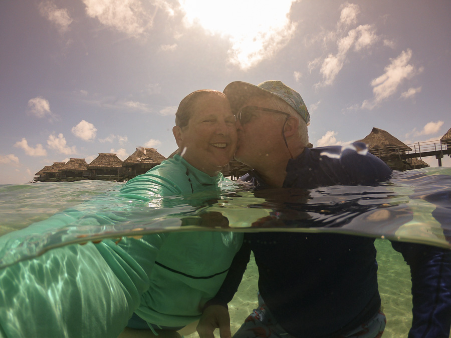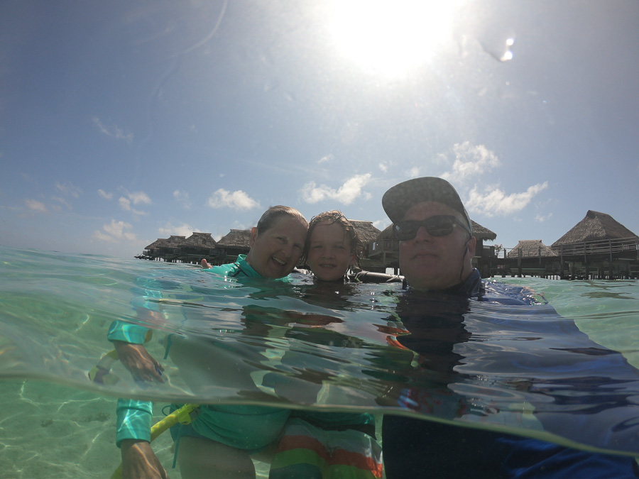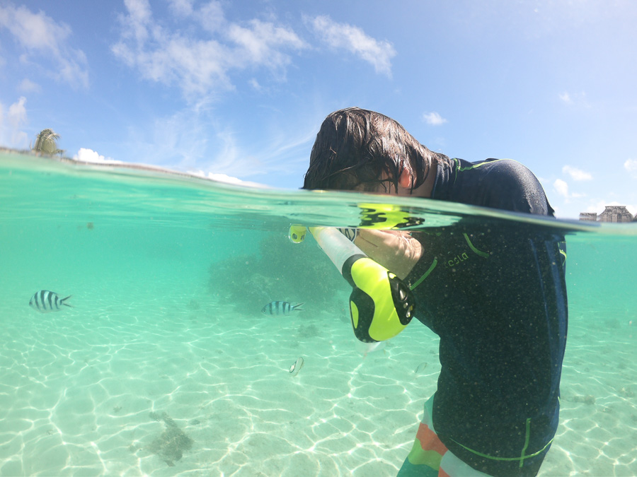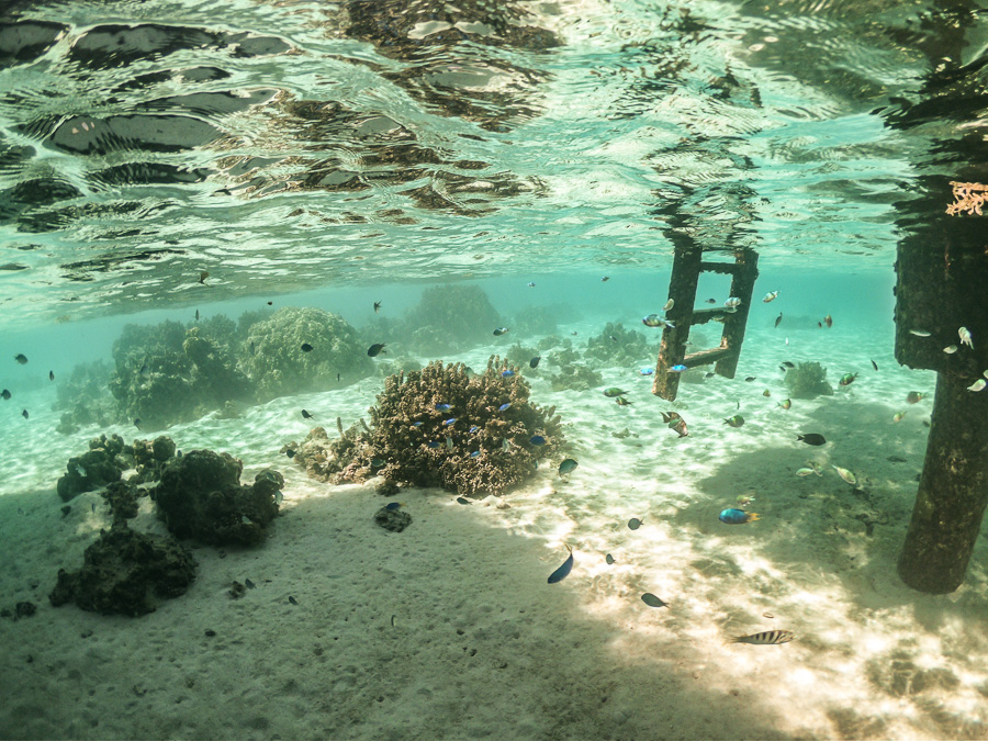 The coral garden under our hut. You can see all the different sizes of the black and white striped fish which are damselfish.
