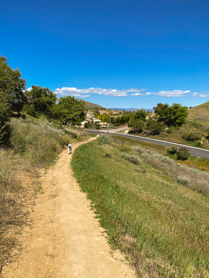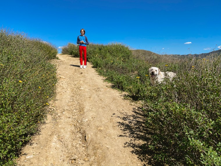 Quinn was once stung by a bee and it really hurt so he avoids them at all cost. He saw a bee on the trail so ran back to the trailhead to wait for me. In order to protect his pack, Sonic runs back and forth between the two of us to make sure we are ok.
