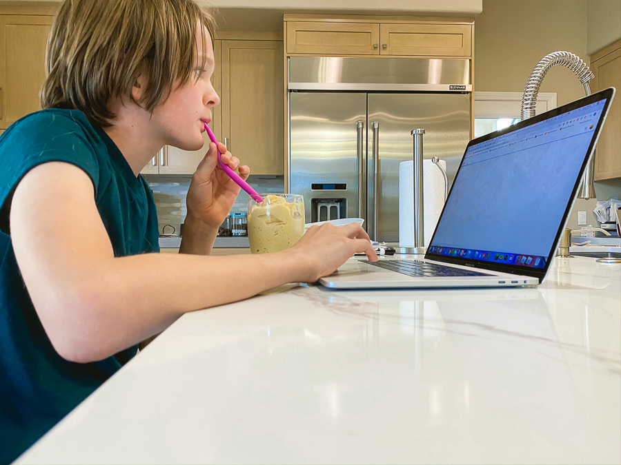 Continuing with distant learning. Quinn signs in to his google classroom to see his assignments. I frequently make him a morning smoothie that includes riced cauliflower, pineapples, mango, banana, protein powder, flax seeds, coconut butter, and almond milk. So delicious and it fills his belly.