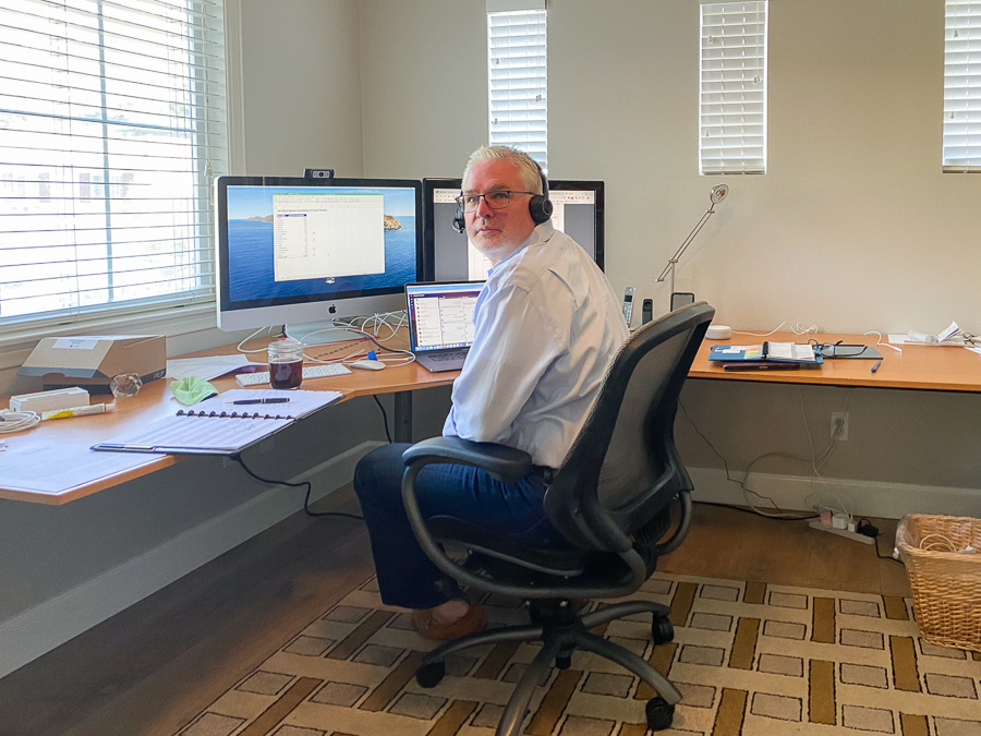 Don getting ready to start his work day. He\’s a little more dressed up than usual because he has board meetings. But he has quite a set up.