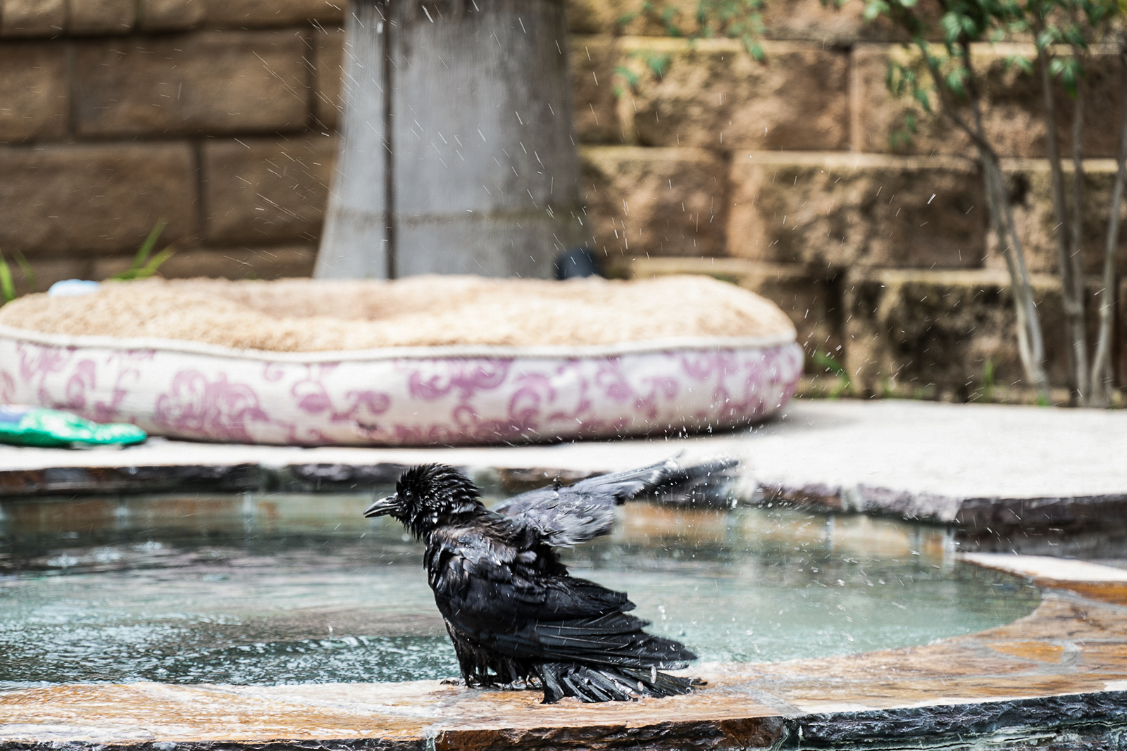 The other day a crow pulled a drowned mouse or rat out of our pool. Ugh. And then this guy stopped by for a bath.