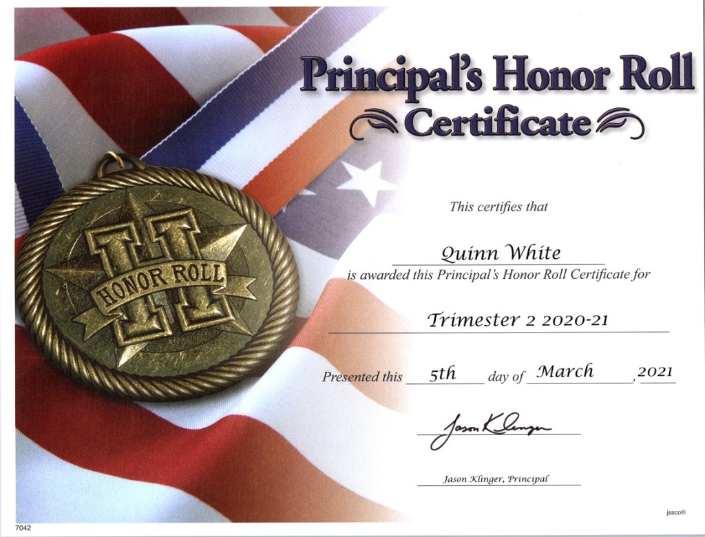 Quinn continues to excel with virtual learning and another trimester on the honor roll. We stopped by the school today to pick up his certificate. Way to go dude!