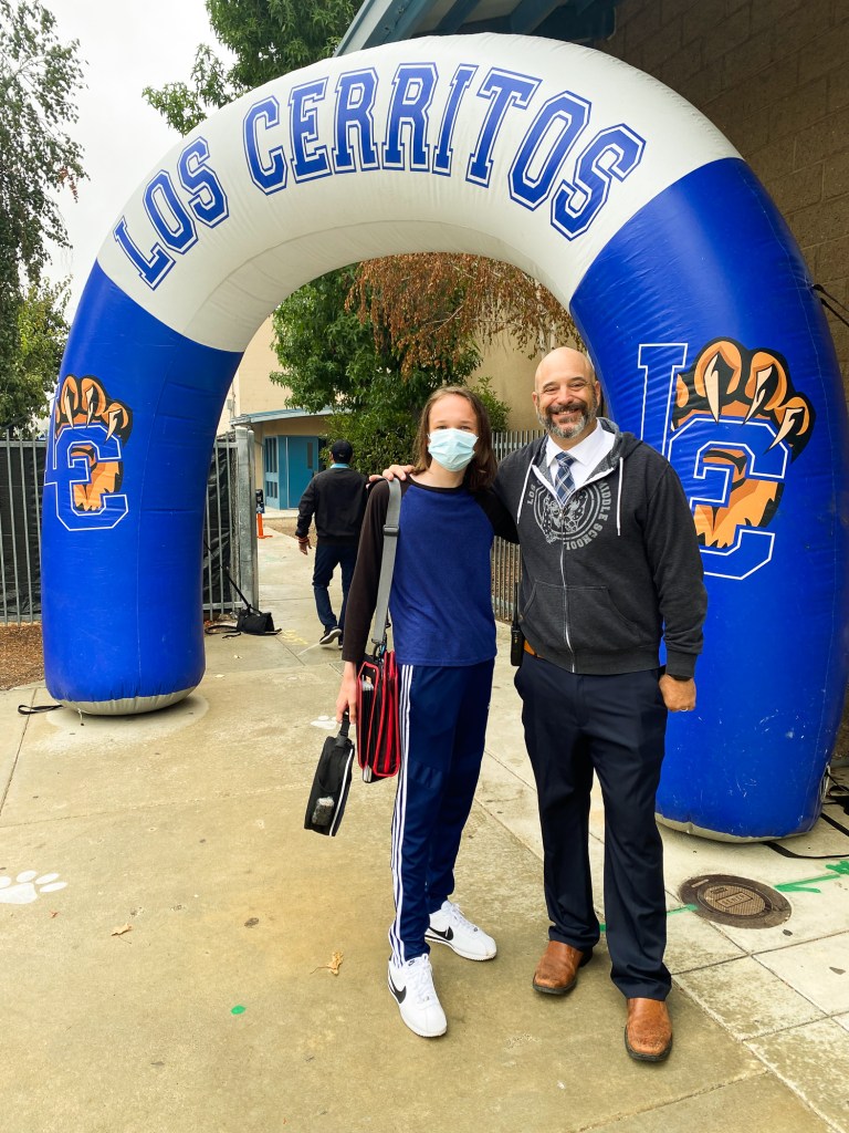 He met his buddy Elias so that they could walk in together. Here he is with Principal Klinger.