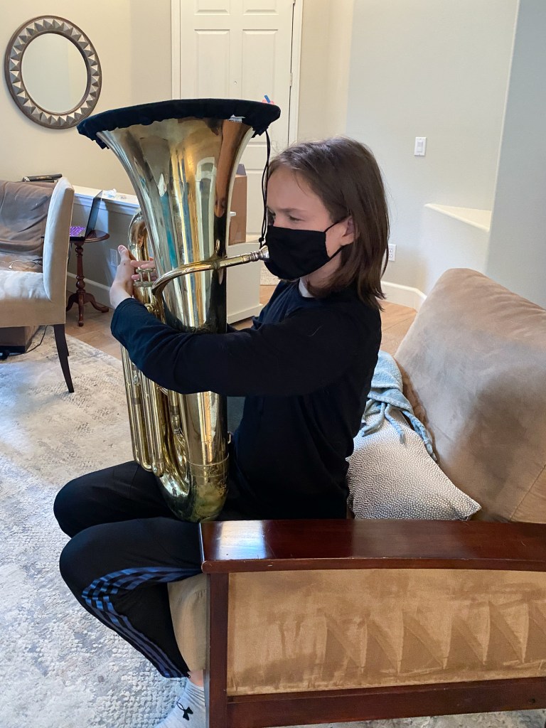 Did you know they make PPE gear for musicians? Quinn is starting up private lessons again and he needed this gear for the lesson. At school they just go outside.